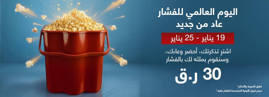 في اليوم العالمي للفشار، احجز تذكرة فيلمك واستمتع بعرض أحضر وعاءك الخاص مقابل 30 ريال قطري*