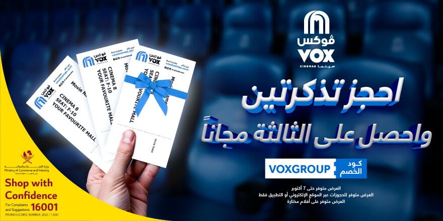 اشترِ 3 تذاكر بسعر تذكرتين في القاعات العادية وقاعات كيدز على مجموعة من الأفلام المختارة. العرض متاح حصريًا عند الحجز عبر الإنترنت من خلال موقع voxcinemas.com أو تطبيق ڤوكس سينما واستخدام الرمز الترويجي VOXGROUP